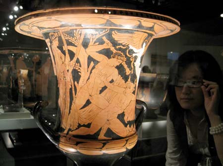 A visitor watch the exhibition called "Agon, the Spirit of Competition in Ancient Greece" at the Capital Museum in Beijing, China, September 14, 2008. [Xinhua]