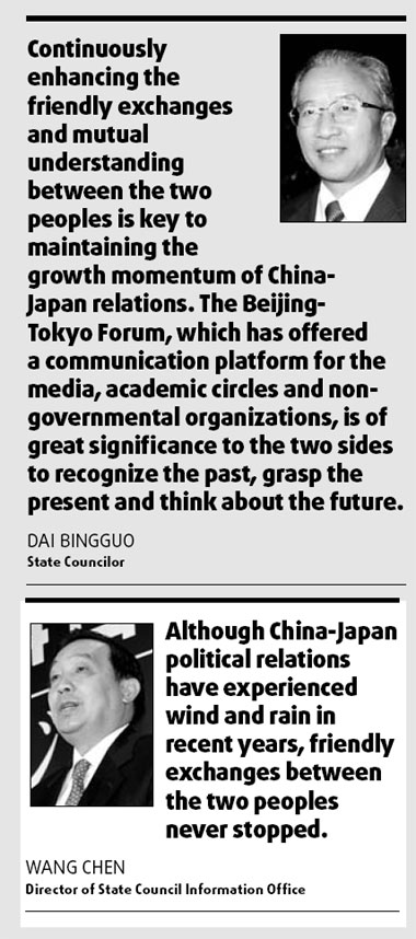 Updated: 2008-09-17 06:37 TOKYO -- China and Japan will push forward their relationship despite obstacles, outgoing Japanese Prime Minister Yasuo Fukuda said on Tuesday. "During President Hu Jintao's visit (to Japan) in May, the two countries signed a joint statement on promoting a strategic relationship of mutual benefit, which clearly shows the direction of bilateral relations," Fukuda said in a message to the 4th Beijing-Tokyo Forum, which opened Tuesday.