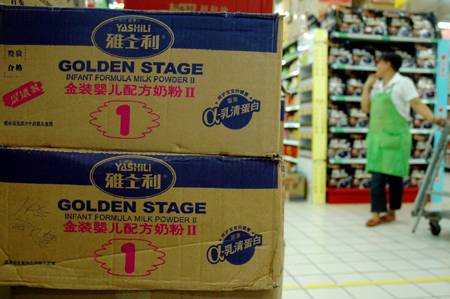 Boxes of infant formula milk powder produced by Yashili, a dairy manufacturer based in South China's GuangdongProvince, are removed from the shelves of a supermarket in Qingdao, East China's ShandongProvince, September 17, 2008. [CFP]
