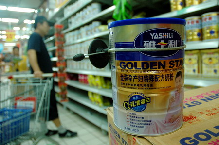 Cans of infant formula milk powder produced by Yashili, a dairy manufacturer based in South China's GuangdongProvince, are removed from the shelves of a supermarket in Qingdao, East China's ShandongProvince, September 17, 2008. [CFP]