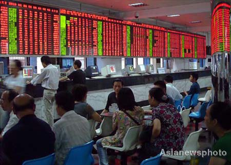 Investors check stock information at a brokerage house in Yichang, Central China's Hubei Province, September 19, 2008. Chinese stocks soared 9.46 percent on Friday in response to an unprecedented package of government measures to support the market, and as a rebound of equities overseas eased fears for the global financial system.[Asianewsphoto]