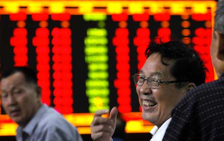A stock investor (C) smiles at a brokerage house in Zhengzhou, Central China's Henan Province, September 19, 2008. Chinese stocks soared 9.46 percent on Friday in response to an unprecedented package of government measures to support the market, and as a rebound of equities overseas eased fears for the global financial system.[CFP]