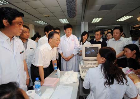 Chinese Premier Wen Jiabao inquires the health condition of a child sickened by tainted milk powder at the ultrasonic scan room of Beijing Children's Hospital in Beijing on September 21, 2008. [Xinhua]