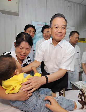 Chinese Premier Wen Jiabao visits an infant who suffered from kidney stones after drinking contaminated milk powder, at Beijing Children's Hospital, September 21, 2008. Chinese authorities continued over the weekend to contain public concerns over widespread milk contamination, punishing local officials for negligence while strengthening inspections of dairy products across the nation. [Xinhua]