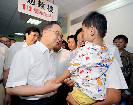 Chinese Premier Wen Jiabao visits an infant who suffered from kidney stones after drinking contaminated milk powder, at Beijing Children's Hospital, September 21, 2008. Chinese authorities continued over the weekend to contain public concerns over widespread milk contamination, punishing local officials for negligence while strengthening inspections of dairy products across the nation. [Xinhua]
