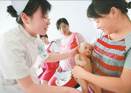 Mothers-to-be learn how to breast-feed at a hospital in Weifang, Shandong province. More and more women are opting to 'go natural' in the wake of the poisoned baby milk scandal. [Zhang Chi]