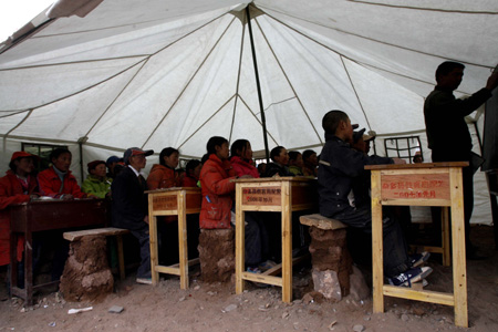 Updated: 2008-09-23 08:33 Nine-year compulsory education has reached 99 percent in Tongren, while in the countryside, only 85 percent of the children complete primary school, aside from the compulsory middle school. Why is that? The main difficulty, said Shau Jigme, is transportation. There is no road from the county center to the school, which sits on top of the mountain, at almost 4,000 m above sea level and 70 km from Tongren. The only way to reach the school is by motorcycle, which takes three hours. When it rains or snows, it's impossible to climb up or down. That is why teachers have to stay at school for 10 consecutive days, living in tents.