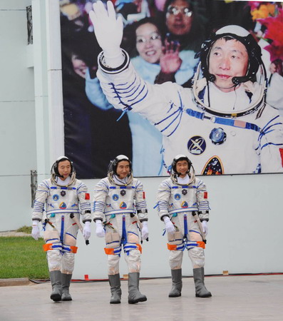 Chinese taikonauts (R-L) Liu Boming, Zhai Zhigang and Jing Haipeng attend the setting-out ceremony at the taikonauts' apartment compound of the Jiuquan Satellite Launch Center in northwest China's Gansu Province, Sept. 25, 2008. China counted down Thursday to its third manned space mission Shenzhou VII which will include the country's first ever space walk. [Xinhua]