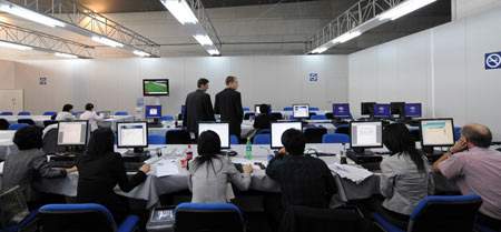 Journalists work at the media center of the second Annual Meeting of the New Champions held by the World Economic Forum at north China's Tianjin Municipality, Sept. 25, 2008. The meeting, also dubbed as "Summer Davos", is to be held here from Sept. 27 through 28. Nearly 700 journalists from home and abroad are going to report the event.[Xinhua]