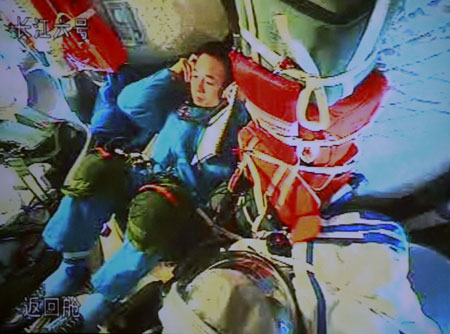 This video grab, taken on September 26, 2008 at the Beijing Space Command and Control Center in Beijing, shows Chinese astronaut Jing Haipeng sitting in Shenzhou VII while two other astronauts are busy assembling the indigenous Feitian extra-vehicular activity (EVA) suit. Astronauts aboard the Shenzhou VII spacecraft, China's third manned spaceship, began to assemble the suit and test its obturation and functions Friday in preparation for the first spacewalk, planned for Saturday afternoon. [Xinhua]
