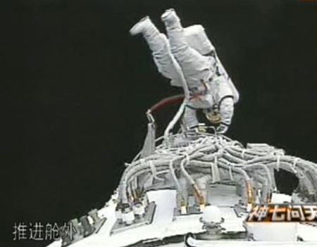 Updated: 2008-09-27 17:08 ![]() In this video grab taken on Saturday, September 27, 2008 from China Central Television, Chinese astronaut Zhai Zhigang conducts China's first spacewalk outside the Shenzhou VII spacecraft. [Xinhua] |