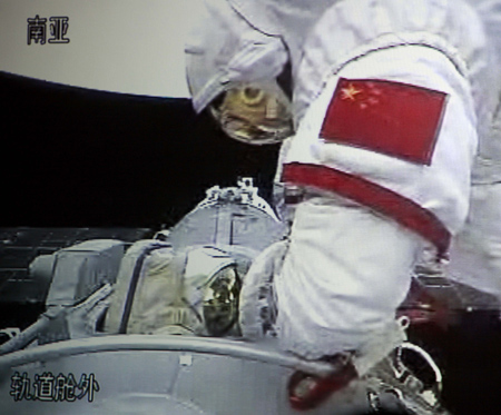 In this video grab taken on Saturday, September 27, 2008 from China Central Television, Chinese astronaut Zhai Zhigang conducts the nation's first spacewalk. [Xinhua]