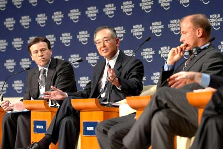 Updated: 2008-09-28 14:36 Yoshihiko Miyauchi (C), Chairman and Chief Executive Officer of Japan's Orix Corporation, speaks while Geoff Cutmore (L), Anchor of CNBC Europe and chairman of the session as well as Thomas Enders, Chief Executive Officer of Airbus, listening during a plenary session entitled the Global Economic Outlook during the second Annual Meeting of the New Champions organized by the World Economic Forum held at Tianjin Binhai Convention and Exhibition Center, north China's Tianjin Municipality, Sept. 27, 2008.[Xinhua]
