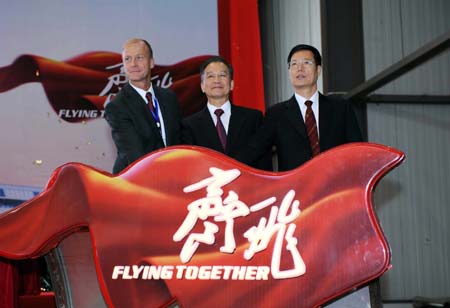 Chinese Premier Wen Jiabao (C), Airbus President and Chief Executive Officer Thomas Enders (L) and Chinese Tianjin Party Chief Zhang Gaoli attend the Airbus Tianjin A320 final assemble line inauguration ceremony in north China's Tianjin Municipality, Sept. 28, 2008. [Xinhua]