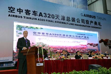 Thomas Enders (L), President and Chief Executive Officer of Airbus, addresses the Airbus Tianjin A320 final assemble line inauguration ceremony in north China's Tianjin Municipality, Sept. 28, 2008. [Xinhua]