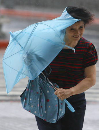 A woman struggles against the wind with her umbrella as Typhoon Jangmi hits Taipei September 28, 2008. The strong typhoon churned toward Taiwan on Sunday, with winds of up to 227 kph and dumping torrential rains as it forced flight and work cancellations ahead of its expected landfall later in the day.[Agencies]