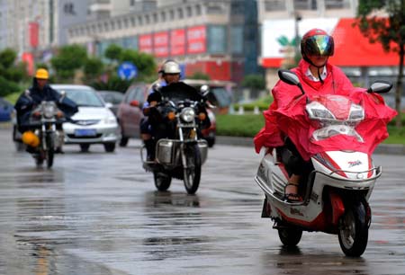Local residents ride on motorbikes in rain in Ningde, southeast China's Fujian Province Sept. 29, 2008. Local meteorological observatory issued an alarm at about 6 am on Monday, saying that Typhoon Jangmi, the 15th and strongest typhoon of this year, divert after entering the Taiwan Straits and will shave coastal areas along Fujian Province. The typhoon was expected to bring heavy rains and high winds in the province.[Xinhua]