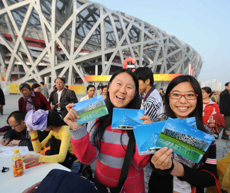 Two tourists show their Olympic post cards in front of the National Stadium, also known as the Bird's Nest, on Sept. 29, 2008. Beijing Olympic venues become hot scenic spots for China's week-long National Day holiday from Sept. 29 to Oct. 5, 2008. [Xinhua]