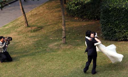 A couple pose for their wedding photos in Shanghai, October 1, 2008, the 59th National Day. China is celebrating the week-long National Day holiday starting from September 29. [Xinhua]