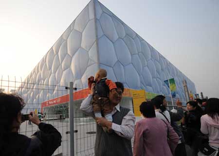 Tourists pose for photos outside the Water Cube at the Olympic Green in Beijing, capital of China, on Sept. 29, 2008. [Xinhua]
