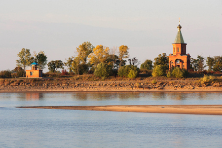 An undated file photo of a church on Heixiazi Island (Bolshoi Ussuriysky Island) at the confluence of Heilongjiang River and Wusulijiang River that serve as a natural border between China and Russia. China will restore sovereign control over half of Heixiazi Island from Russia from October 14, 2008 after the two countries jointly unveil a stone monument on the Island. Heixiazi Island was occupied by the former Soviet Union during a 1929 border skirmish. [CFP] |
