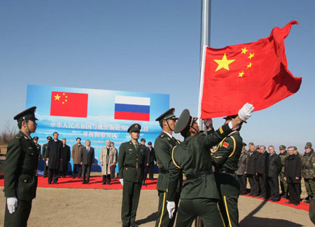 Chinese soldiers raise a national flag during a ceremony on the Heixiazi Island Oct. 14, 2008. China and Russia held a ceremony on the Heixiazi Island Tuesday to unveil the boundary markers for the eastern section of their border. [Xinhua]