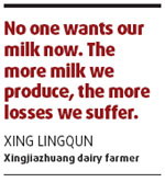 Updated: 2008-10-15 07:59 ZHENGDING, Hebei: Dairy farmer Xing Lingqun should have been thrilled last week when one of his cows gave birth to a calf and began to produce milk. But he was not. "No one wants our milk now. The more milk we produce, the more losses we suffer," said the 61-year-old dairy farmer, who raises 11 cows in nearby Xingjiazhuang village, where 80 percent of the residents are surnamed Xing. "We're desperate." Since the baby formula produced by the Shijiazhuang-based Sanlu Group was found tainted with melamine, an industrial chemical, about four weeks ago, the milking station in Xing's village has stopped accepting any raw milk. Melamine-laced baby formula has caused the deaths of four infants and kidney stones in 53,000 others.