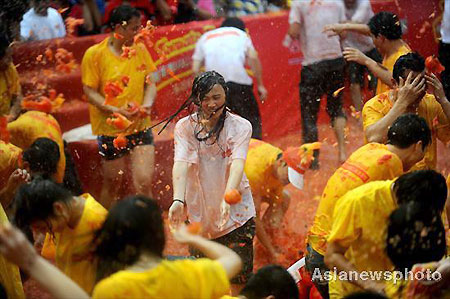 People throw tomatoes at each other at Huanan Mall in Dongguan City, Guangdong province, October 19, 2008. Some 15 tons of ripe tomatoes were used. The tomato fight attracted more than 10,000 people. [Asianewsphoto]