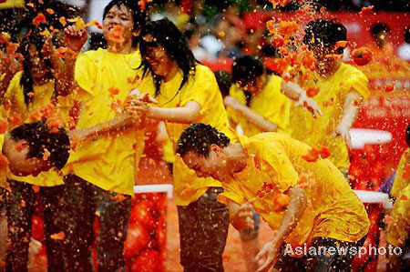 People throw tomatoes at each other at Huanan Mall in Dongguan City, Guangdong province, October 19, 2008. Some 15 tons of ripe tomatoes were used. The tomato fight attracted more than 10,000 people.[Asianewsphoto]