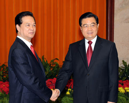 In a meeting here with visiting Vietnamese Prime Minister Nguyen Tan Dung on Wednesday, Chinese President Hu Jintao proposed the two neighboring countries always keep the overall situation of the bilateral relations in mind and make efforts to strengthen bilateral efforts and properly settle the issues concerning the South China Sea. "We should make it (South China Sea) a place of peace, cooperation and friendship," Hu said.