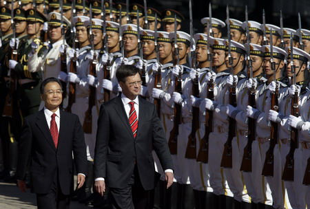 Chinese Premier Wen Jiabao (L) walks with Prime Minister Jan Peter Balkenende of the Netherlands as they inspect an honour guard during an official welcoming ceremony at the Great Hall of the People in Beijing October 23, 2008. [Agencies]