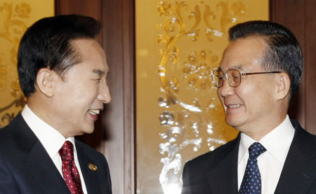 Chinese Premier Wen Jiabao (R) and South Korea's President Lee Myung-bak pose for photographers before a breakfast meeting for ASEAN+3 leaders in Beijing October 24, 2008.  [Agencies]