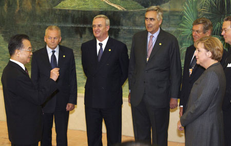 German Chancellor Angela Merkel (R) looks on as Chinese Premier Wen Jiabao (L) talks with German entrepreneurs at the Great Hall of the People in Beijing October 23, 2008. [Agencies]
