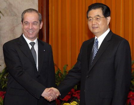 Malta's Prime Minister Lawrence Gonzi (L) shakes hands with Chinese President Hu Jintao during their meeting at the Great Hall of the People in Beijing October 23, 2008. [Agencies]