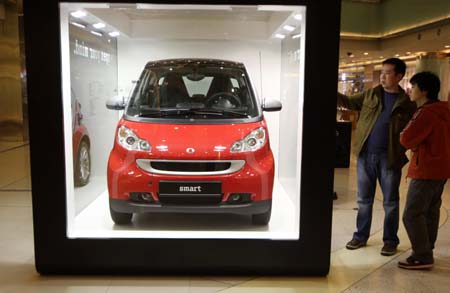 Two men look at a vending machine called "smart" with a full-size Smart Car in it at Wangfujing shopping street in downtown Beijing October 29, 2008. Pushing the button on the vendor won't exactly pop out a car, but it does dispense a branded cube also called "smart" at the price of 1 yuan each, containing information of the new models of Mercedes-Benz. [CFP]