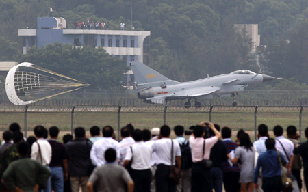 A Chinese-made Chengdu J-10 fighter jet takes part in a flight program at the 7th China International Aviation & Aerospace Exhibition or 'Airshow China 2008' in the southern Chinese city of Zhuhai November 4, 2008. About 600 exhibitors with more than 60 aircraft, representing 35 countries and regions, have been registered to take part in the airshow. [Agencies] |