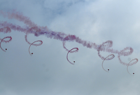 Parachuters from the Chinese air force perform at the 7th China International Aviation & Aerospace Exhibition or 'Airshow China 2008' in the Chinese southern city of Zhuhai November 4, 2008. [Xinhua] |