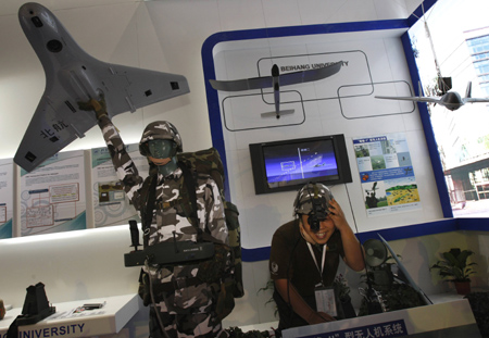 An exhibitor at the aviation show in Zhuhai demonstrates a made-in-China Unmanned Aerial Vehicle, one day before the opening of the 7th China International Aviation & Aerospace Exhibition, or Airshow China 2008, in the southern Chinese city of Zhuhai, November 3, 2008. The hi-tech piece of kit is designed to carry heavy weapons but can be operated by a single soldier. [Agencies] |