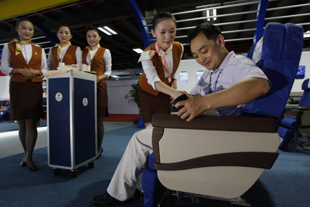 A flight attendant of local airliner 'Joy Air', a regional airline in western China, helps a visitor to fasten a seat belt at a mock cabin at the 7th China International Aviation & Aerospace Exhibition or 'Airshow China 2008' in the southern Chinese city of Zhuhai, November 4, 2008. [Agencies] |