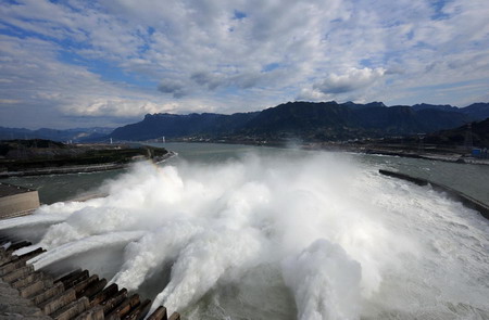 Flood water gushes out from the sluice gates of the Three Gorges Dam which is located in Yichang of central China's Hubei province on November 7, 2008. The dam starts to discharge water to face the infrequent winter flood as a result of continual rainfall in the upriver regions of the Yangtze River.[Xinhua]