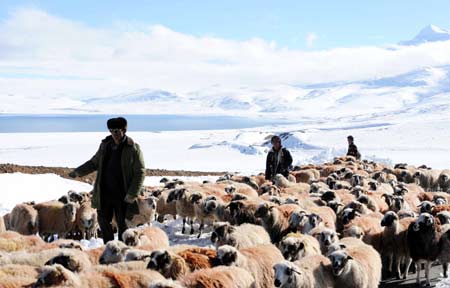 Tibetan shepherds herd their sheep home after a road blocked by snowstorms on October 26 was cleared by soldiers and relief workers on November 1, 2008. [Xinhua]
