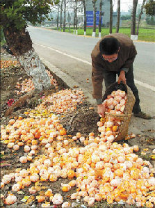 A farmer dumps basketsful of oranges on the side of a road in Yichang, Hubei province, November 10, 2008. The oranges have been peeled so that their skin can be used as herbal medicine. [Liu Junfeng]