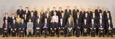 World Bank President Robert Zoellick (back row L) poses for an official picture with the G20 Finance Ministers and Central Bank Chiefs during their meeting in Sao Paulo November 8, 2008. [Agencies]