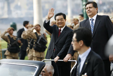 Chinese President Hu Jintao (L) waves next to Peru's President Alan Garcia as they arrive in a car at the government palace in Lima November 19, 2008. [Agencies]