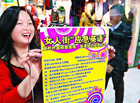 The pamphlet, handed out to shop owners earlier this week, is the latest move by the local authorities to promote English usage in the area to boost business during tough economic times - and made even more pressing with the opening of the new US embassy complex last month, vendors said. The district also hosts the embassies of Israel, Malaysia, the Republic of Korea, Brunei and Japan, altogether bringing hundreds of foreigners daily to Lady Street, or Nu Ren Jie, Tang Zhenjun, deputy manager of the shopping area, said on Wednesday. Employees of the 700-odd shops in Lady Street - more than 70 percent sell clothes and the rest offer shoes, bags and household goods - will have to pass an exam on the English phrases in three months if they want to continue working in the area, Tang said. There will also be an hour of English broadcasts on speakers in the market at 9 am every morning and oral English lessons for employees in the near future, he said. But with more customers being driven away by her efforts to follow the new directive, Yang is not so sure her business will hold up to the latest efforts to promote English usage. "Such 'emergency English' is not a tool for business or communication, but rather an obstacle to them, because most foreigners cannot understand such weird English," Yang told China Daily. But the Anhui native intends to soldier on and peruse her English textbook because she wants to continue working in Lady Street. Hu Yongsheng, who also sells shoes in the street, is worried about his future, because he knows few Chinese characters except his name, let alone English. "For people of my age, it is mission impossible," Hu, 37, said as he flipped through the pamphlet. Ou Qing'er, who sells bags in the market, is more optimistic about the latest campaign. "I love English and enjoy talking with foreigners. I see them not only as my customers but also my friends," the 35-year-old said in fluent English, as she pointed to her friend Eunice Silvia C. Fernandes, wife of the minister counselor of the Angola embassy. Fernandes could not agree more. "I always manage to seal the deal, with all the details like size, color and numbers done, although I cannot speak Chinese. Just let this 'emergency English' go, because the language of shopping is universal," Fernandes said, adding that she was also learning Chinese. The move to promote English usage is not without controversy. Qiu Baochang, a lawyer and also a consultant for legal affairs at Beijing Lawyers Association, said the market administrators have no right to terminate contracts with vendors because of their English proficiency. An official with The Beijing Speaks Foreign Languages Program (BSFLP) also said the forced-feeding method in teaching English erects obstacles to learning the language. "The practice should be stopped," Liu Yang, director of BSFLP office, was quoted by Beijing Youth Daily as saying. |