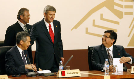 Canada's Prime Minister Stephen Harper (C) takes his seat near Singapore's Prime Minister Lee Hsien Loong (L) and Peru's President Alan Garcia (R) before the start of the first meeting of the Asia-Pacific Economic Cooperation (APEC) summit in Lima,[Agencies]