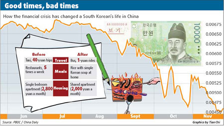 Updated: 2008-11-28 08:06 South Korean student Shin Hye-young used to live it up. The 24-year-old undergraduate at Beijing's University of International Business and Economics (UIBE) had a single-bedroom apartment in the well-heeled area of Wangjing all to herself. She would eat out at restaurants five days a week, indulging in the choicest cuts of beef in Korean barbecues with her friends.