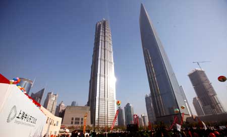 A photo taken on Nov. 29, 2008 shows the building site of Shanghai Center with Jin Mao Tower and Shanghai World Financial Center in the backdrop in Shanghai, East China. Construction began here Saturday on China's tallest building, a 632-meter skyscraper called the Shanghai Center. The center will be taller than the other two most famous skyscrapers in Shanghai, the 420.5-meter-tall Jin Mao Tower and the 492-meter-tall Shanghai World Financial Center, all located in the central financial district of Lujiazui. The new building will be completed in 2014, costing more than 14.8 billion yuan (about US$2.2 billion). [Xinhua]