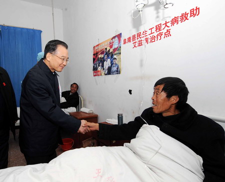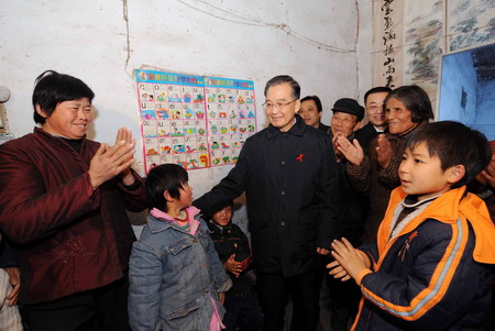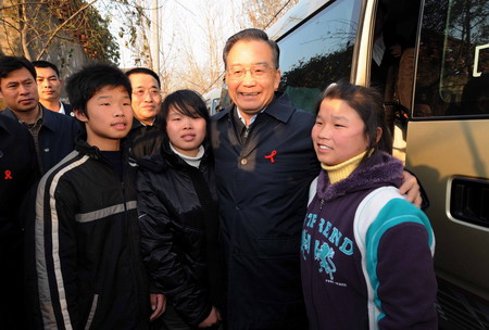Upon his arrival in Yingzhou District, Fuyang City of Anhui on Saturday afternoon, Wen went to the home of Huang Jinhong, a high schoolgirl whose parents died of AIDS. Huang and her sister and brother were invited by Wen to the Zhongnanhai, the Chinese leadership's Beijing compound, two years ago when the premier chatted with them and inquired about their needs. With a red ribbon on his bosom, Wen embraced the three children and inquired about their study and life. He was very glad to see the children, together with their grandmother in her 80s, had obtained living subsidies for families struck by the disease. By giving each of them a set of dictionary and a schoolbag, Wen encouraged them to study hard and lead a meaningful life. Fuyang's Yingzhou District has a high HIV/AIDS prevalence. The documentary "The Blood of Yingzhou District" by Ruby Yang and Thomas Lennon, which won the 2006 Oscar for Best Documentary Short Subject, told stories of children orphaned by AIDS in a poor village of Yingzhou. Later, Wen went to the Dahu Village of the Funan County where HIV carriers were in a large number. Villagers with HIV burst into tears when the premier shake hands and talk freely with their fellows. Wen became silent when he found a seven-year-old girl Xiao Xue was a HIV carrier. He let the girl sit beside her and encouraged her to have faith in life. He asked about the implementation of national AIDS prevention and control policies in the village and praised the local efforts that the "four frees and one care" policy were implemented well since 2004. The policy included providing free anti-viral drugs and treatment to poor patients, free counseling and antibody pre-screening services, free counseling and maternal tests for pregnant women and free tuition fees for children orphaned by AIDS. The local government also offered living subsidies to AIDS patients and orphans.