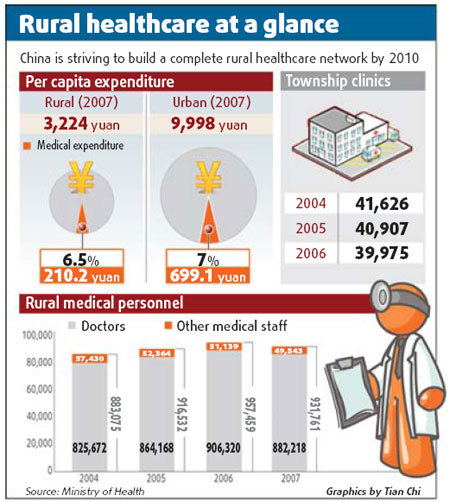Updated: 2008-12-04 07:50 When 45-year-old Wang Xiuzhi fractured her knees working in the fields, she was faced with the daunting option of traveling at least three hours by bus to hospitals in the city. Treatment there was guaranteed to be expensive for farmers like her.